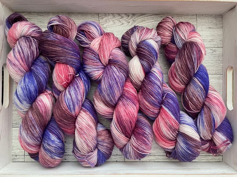 The beauty of hand dying is each hank has its own unique color. No two hanks are alike.